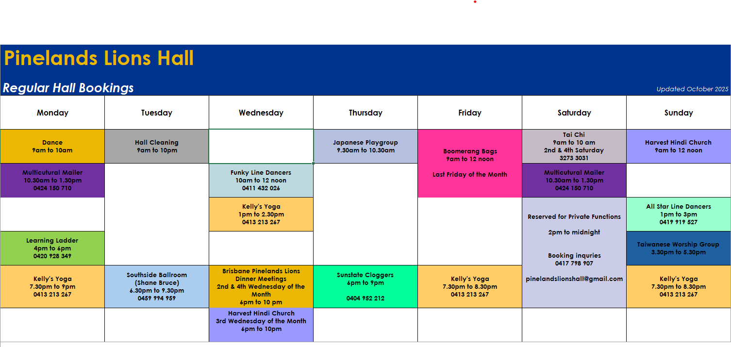 Maintained by The Members of the Pinelands Lions Club, our Community Hall is For Hire for Weddings, Parties, Functions, Dancing Schools as well as Community Groups. Hire Rates are Very Competitive and can be Booked through our Hall Manager.