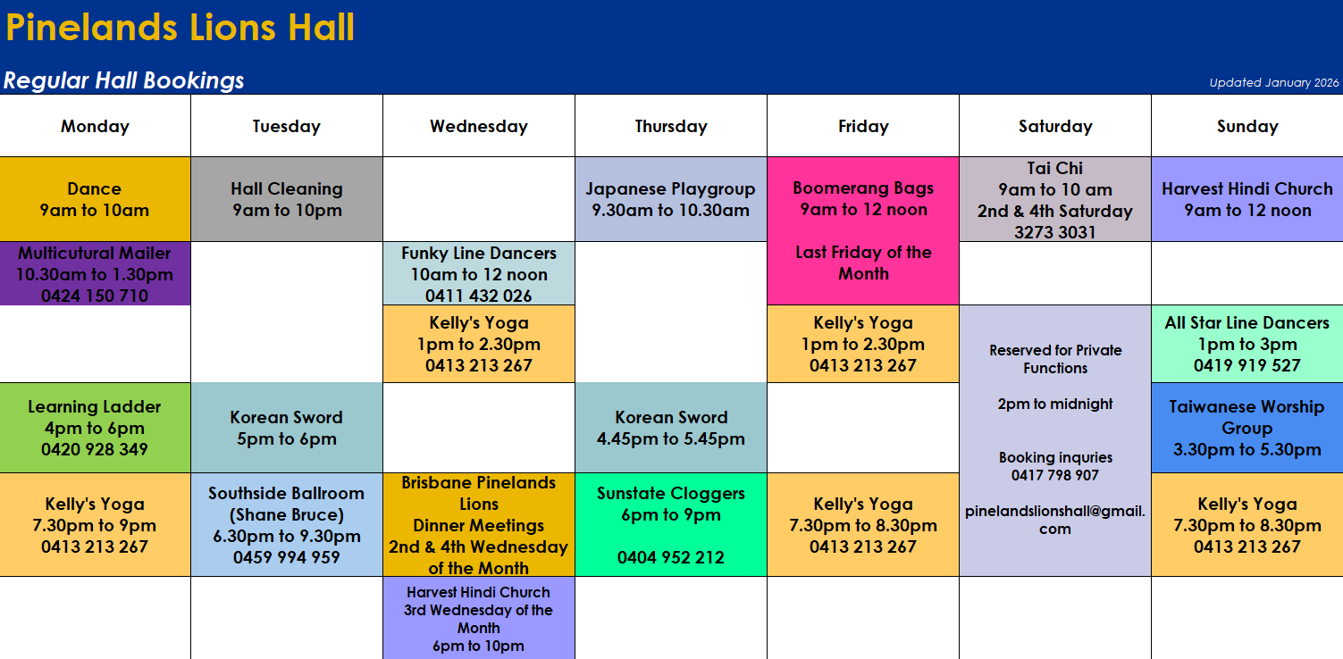 Maintained by The Members of the Pinelands Lions Club, our Community Hall is For Hire for Weddings, Parties, Functions, Dancing Schools as well as Community Groups. Hire Rates are Very Competitive and can be Booked through our Hall Manager.