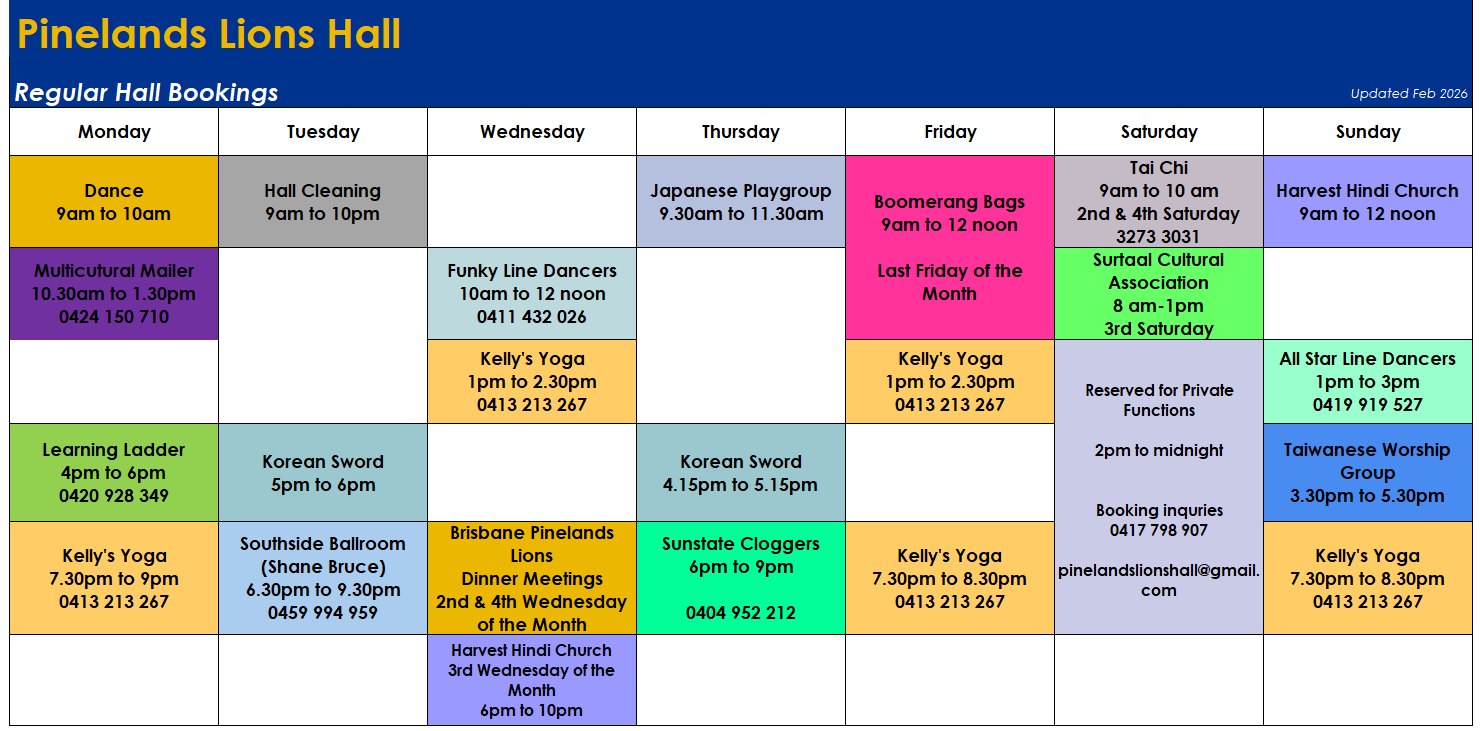 Maintained by The Members of the Pinelands Lions Club, our Community Hall is For Hire for Weddings, Parties, Functions, Dancing Schools as well as Community Groups. Hire Rates are Very Competitive and can be Booked through our Hall Manager.